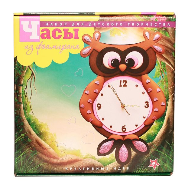 - В наборе: основа для часов, часовой механизм, комплект стрелок, FOM EVA разных цветов, готовые детали-заготовки для часов на самоклеющейся основе и без, пастель, губка, зубочистки, полубусины, клей, выкройка Инструкция.