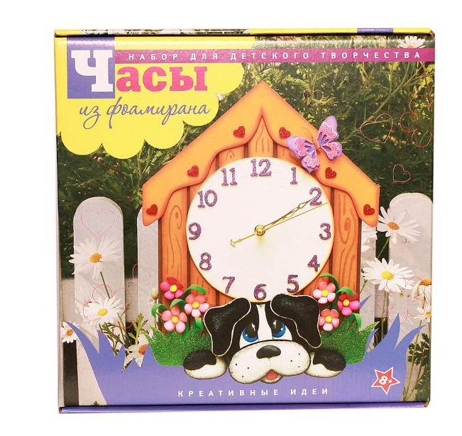 - В наборе: основа для часов, часовой механизм, комплект стрелок, FOM EVA (фоамиран) разных цветов, готовые детали-заготовки для часов, пастель, губка, зубочистки, клей, выкройка, наполнитель, инструкция декоративные помпончики,