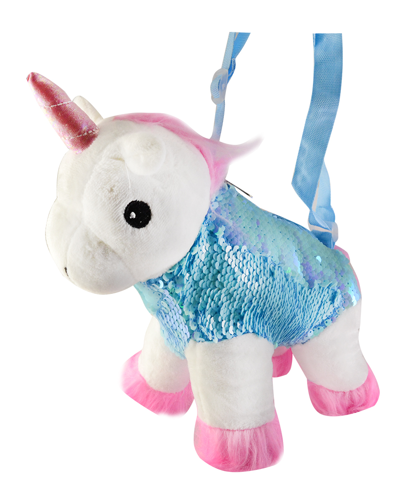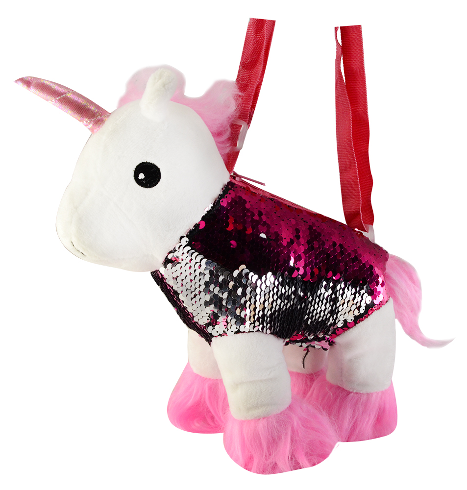 Небольшая плюшевая сумочка с ремешком в виде единорога. Яркая сумочка станет отличным подарком для ребенка, и позволит ему носить с собой небольшие личные вещи или карманные деньги.