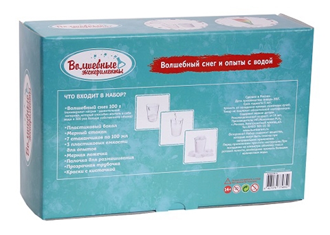 - В наборе: волшебный снег, пластиковый бокал, мерный стакан, 6 стаканчиков, 3 пластиковых емкости для опытов, мерная ложечка, палочка для размешивания, прозрачная трубочка, краски с кисточкой