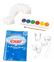 Вы узнаете, что такое Волшебный снег, сможете сделать его всего за одну минуту и понаблюдать за тем, как он стремительно увеличивается в размерах. Вы также узнаете, как сделать, чтобы иголка не тонула в воде, какое свойство воды позволяет переворачивать надписи, как сделать радугу в стакане. Набор подходит для развлечения всей семьей, проведения опытов в школе и дома, подарков или призов. Он сочетает в себе веселую игру, элемент чуда и радость научных открытий.