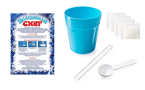 В наборе: снег 40г, пластиковый стакан, мерная ложка, палочка для размешивания, цветная инструкция.