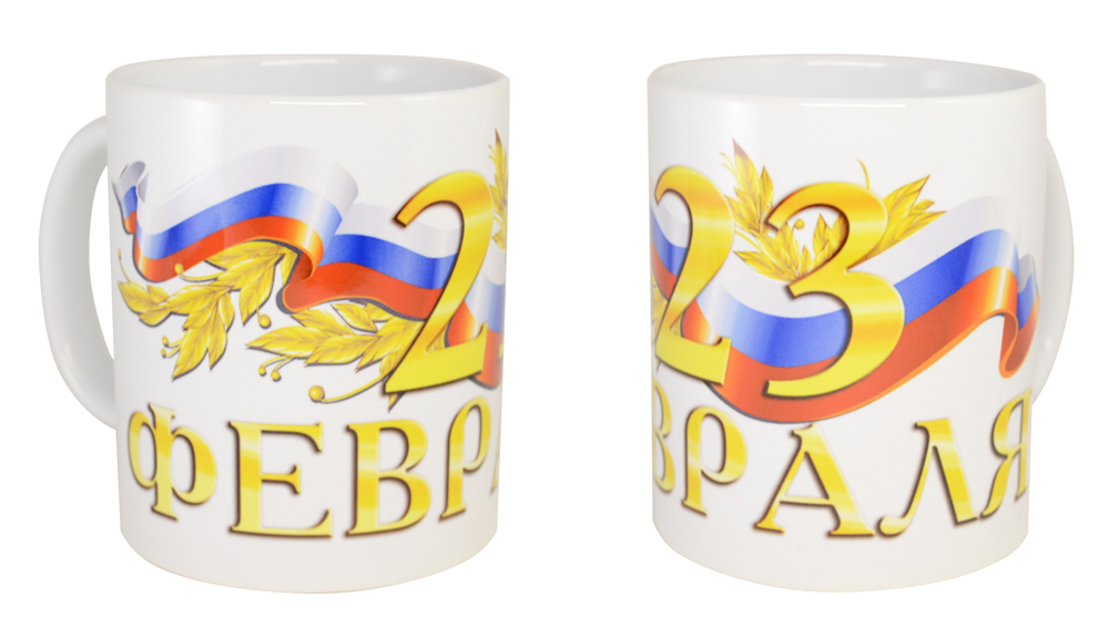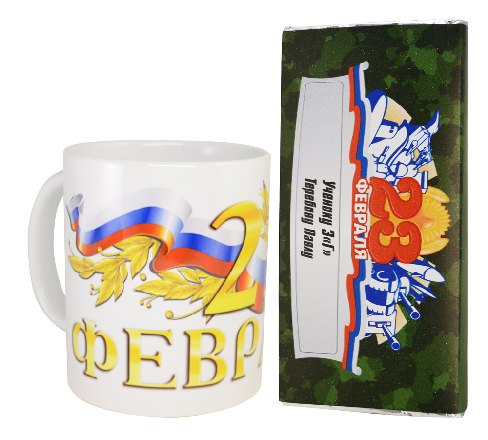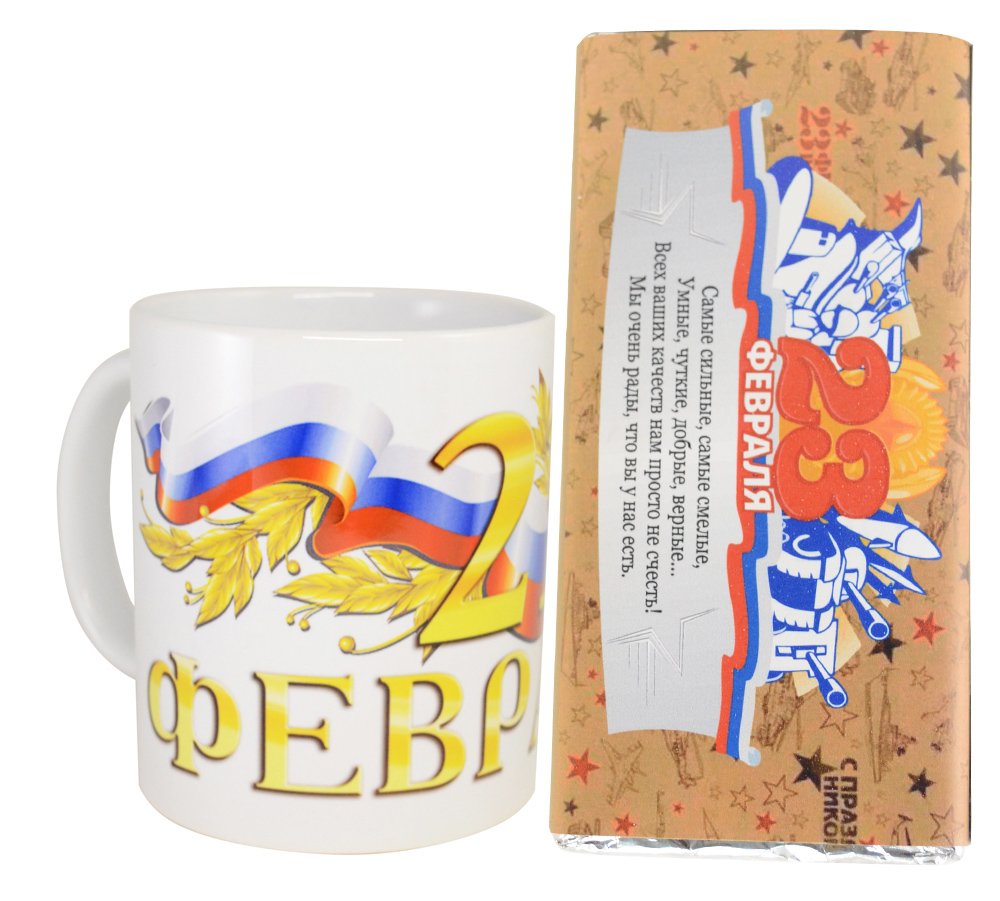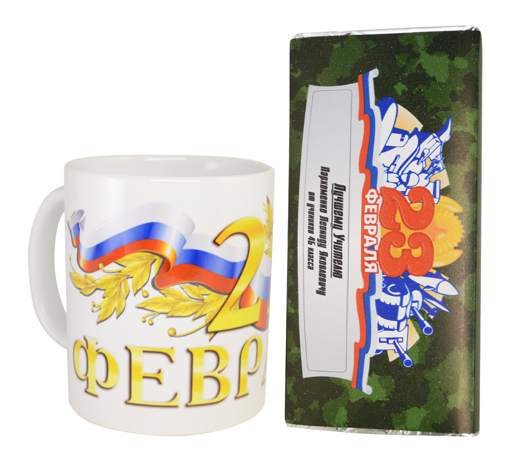 Кружка "С 23 февраля" с шоколадом в поздравительной обертке