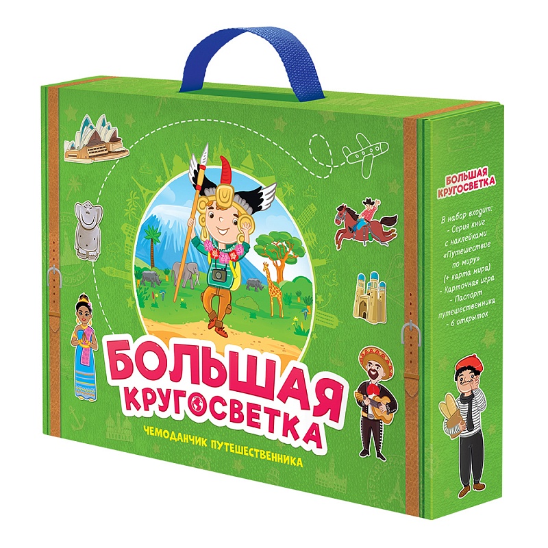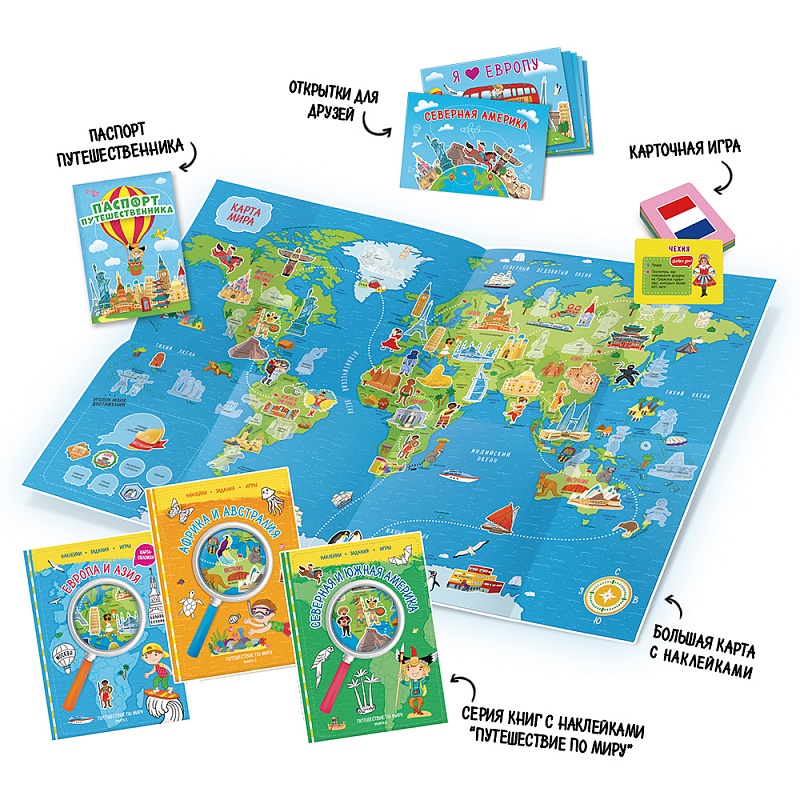 - В наборе: 3 книги, карта с наклейками, игровые карточки, паспорт путешественника, открытки