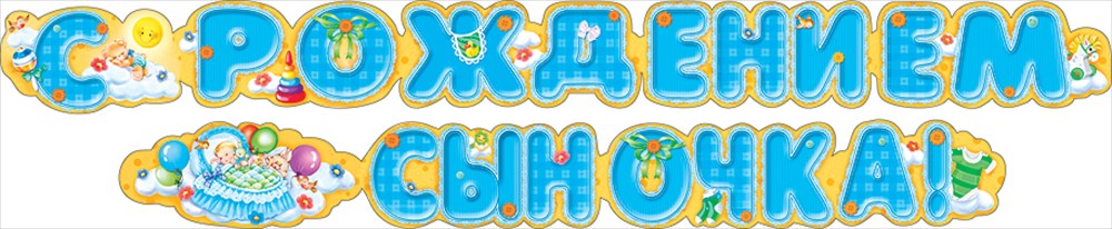 Яркая гирлянда в виде надписи "С рождением сыночка!" из мелованного картона к рождению ребенка. Состоит из двух отдельных частей.