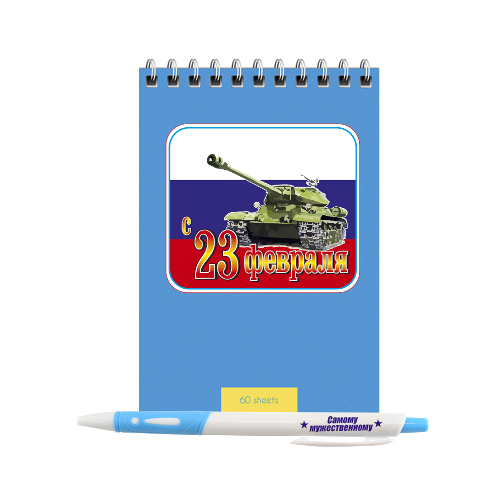 - В наборе : праздничный блокнот и ручка с надписью "Самому мужественному"