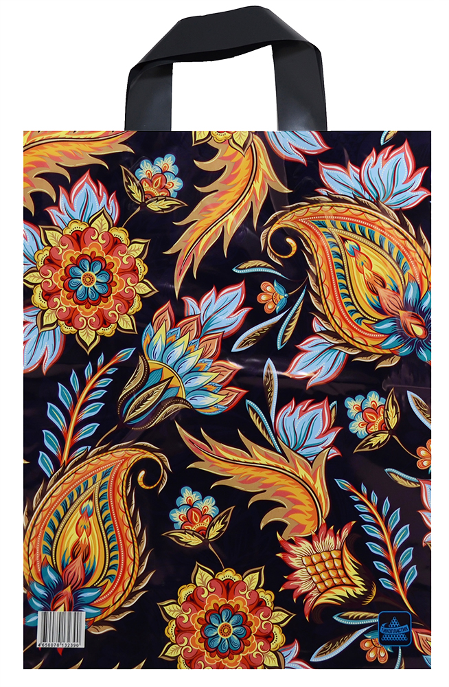 Яркий подарочный полиэтиленовый пакет с удобными и надежными ручками-петлями.