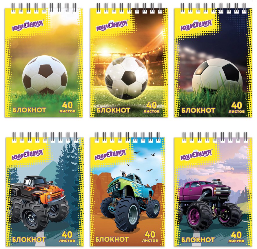 Блокнот А7, 40 листов, клетка ЮНЛАНДИЯ, "МОНСТР-ТРАК/ФУТБОЛ" 75*105 мм, гребень 129859
