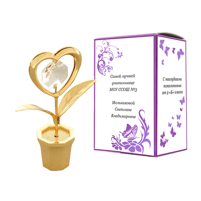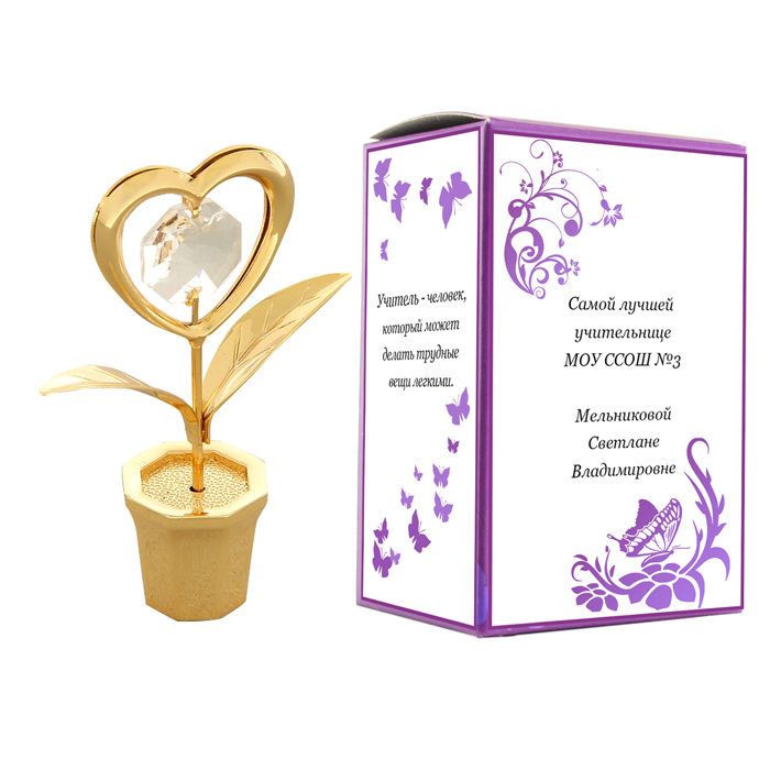 Красивая статуэтка из металла в виде цветка, у которого бутон- сердце, инкрустирована эксклюзивными кристаллами Swarovski. Станет отличным подарком для педагогов или выпускников детских садов и школ, легко украсит любой интерьер домашнего очага или рабочего места, а памятная надпись на подарочной коробке сделает этот подарок особенным и запоминающимся!