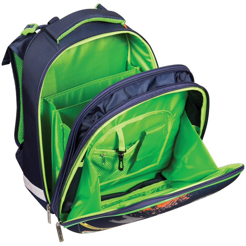 Основное отделение оснащено разделительными перегородками-органайзерами, которые позволят аккуратно разместить тетради и книги, уплотненная мягкая ручка и петля для подвешивания к парте делают ранец очень удобным. Дно ранца выполнено из ПВХ и оснащено пластиковыми ножками для защиты от загрязнений и влаги. Светоотражающие элементы на лямках, передней и боковых частях ранца обеспечивают безопасность ребенка на дороге.