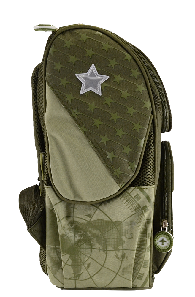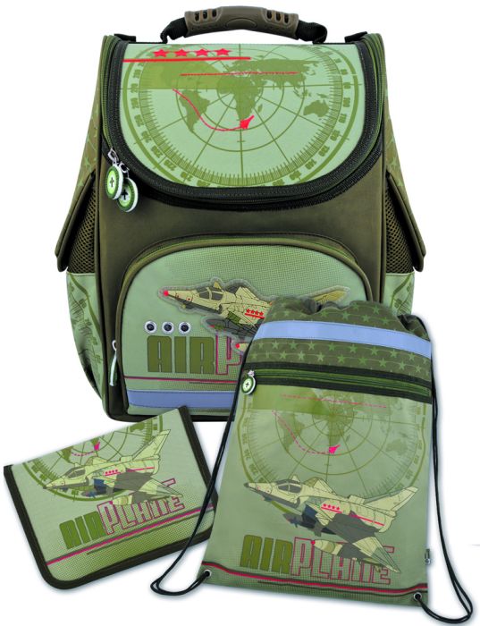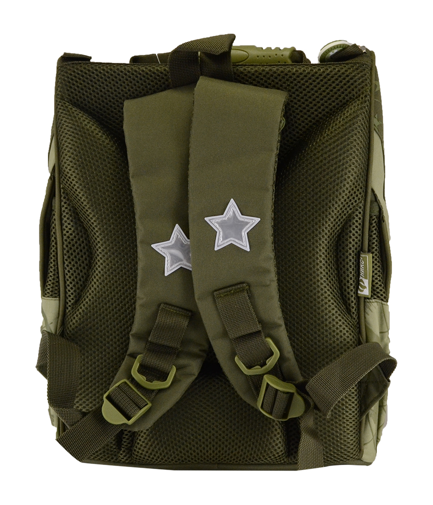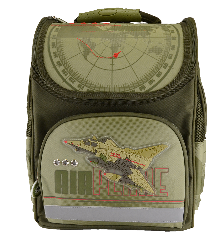 Ранец 1 отделение с секциями из водонепроницаемой ткани (полиэстер). Формоустойчивая жесткая спинка из сетчатой ткани и поролона. Карточка для персональных данных, карабин для ключей в основном отделении ранца.