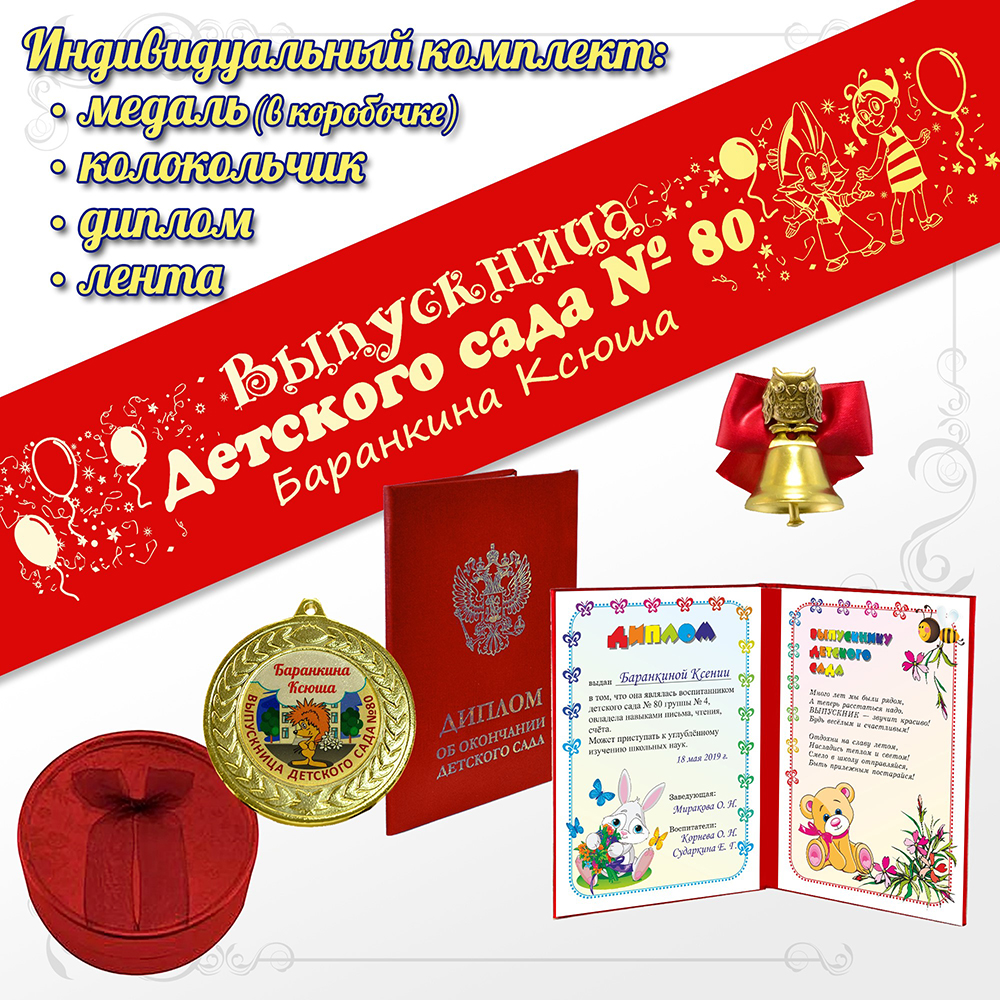 - В наборе: именной диплом, именная атласная лента, колокольчик, медаль с гравировкой, лента для медали, коробочка под медаль