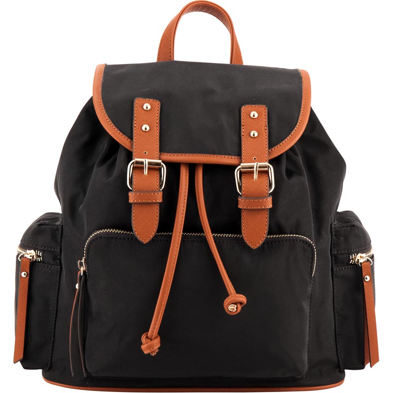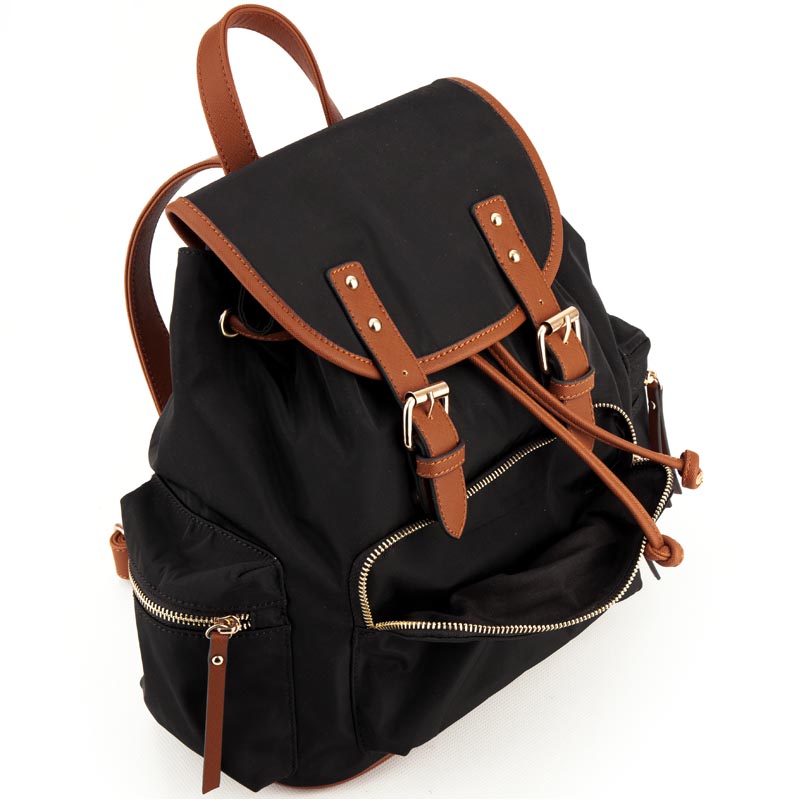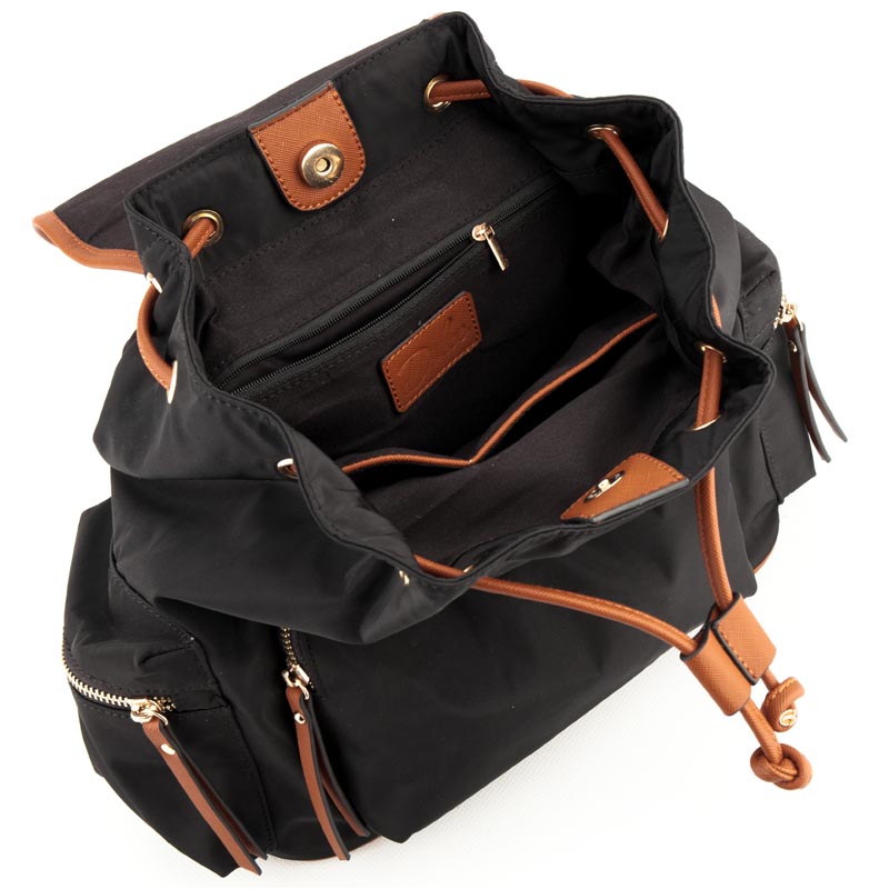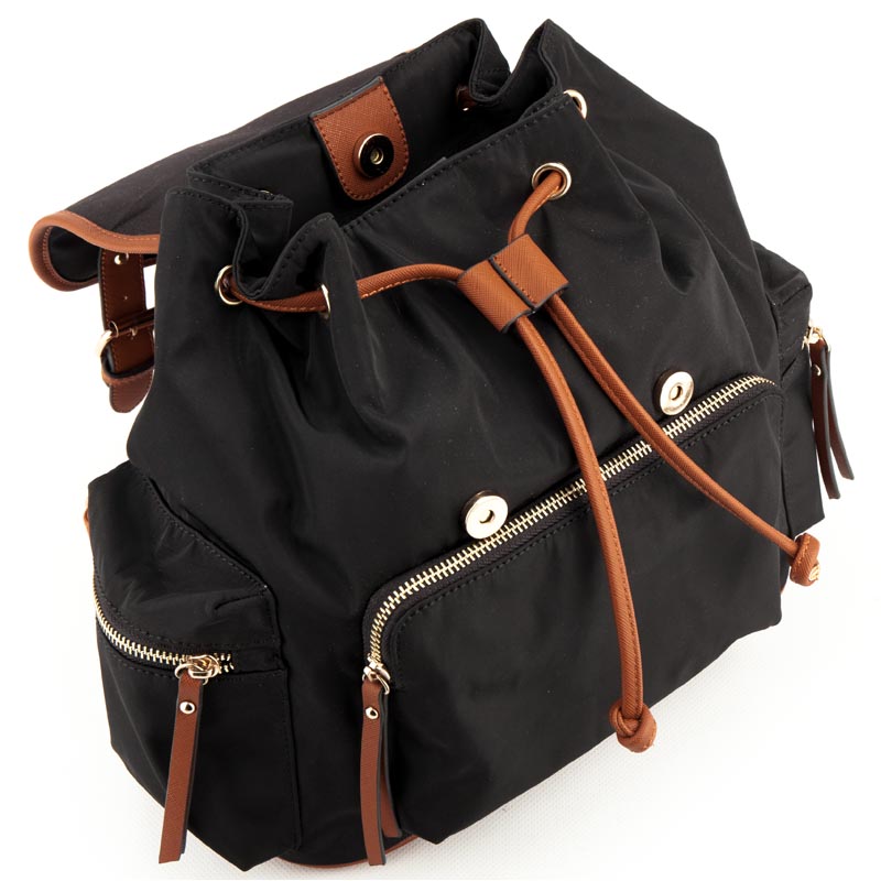 Рюкзак утягивается на шнуре и закрывается с помощью двух магнитных кнопок, скрытых под декоративными ремнями. Это удобно и надежно закрепит содержимое изделия.