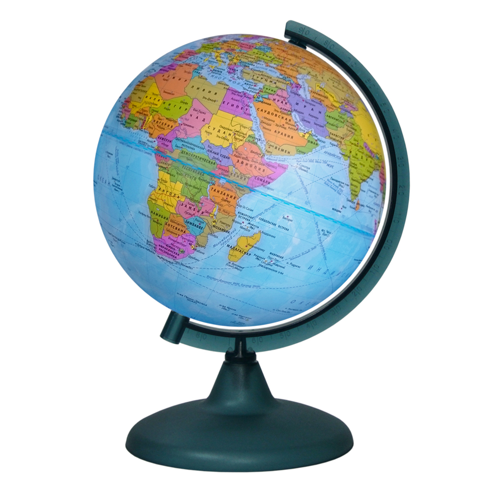 Глобус политический на пластиковой подставке и дуге призван дать представление о политическом устройстве мира. На нем, на общегеографической основе показаны границы государств и демаркационные линии, столицы и крупные населенные пункты, железные дороги и морские рейсы, научные станции в Антарктике, линии перемены дат