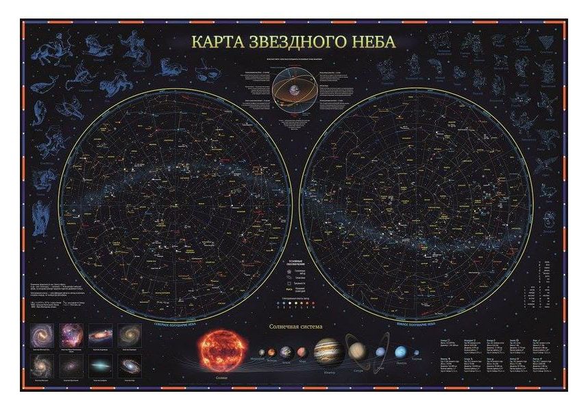 Эта подробная карта звездного неба поможет детям и взрослым познакомиться с уникальным миром космоса. На ней представлены северное и южное полушария звездного неба, обозначен Млечный Путь, планеты Солнечной Системы, созвездия и самые крупные галактики.
