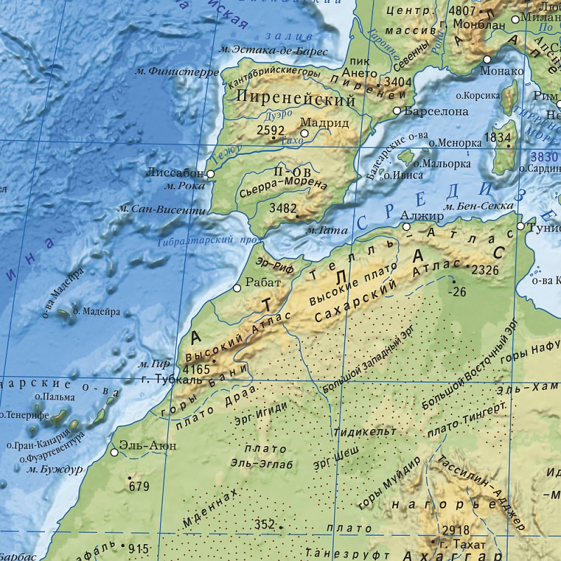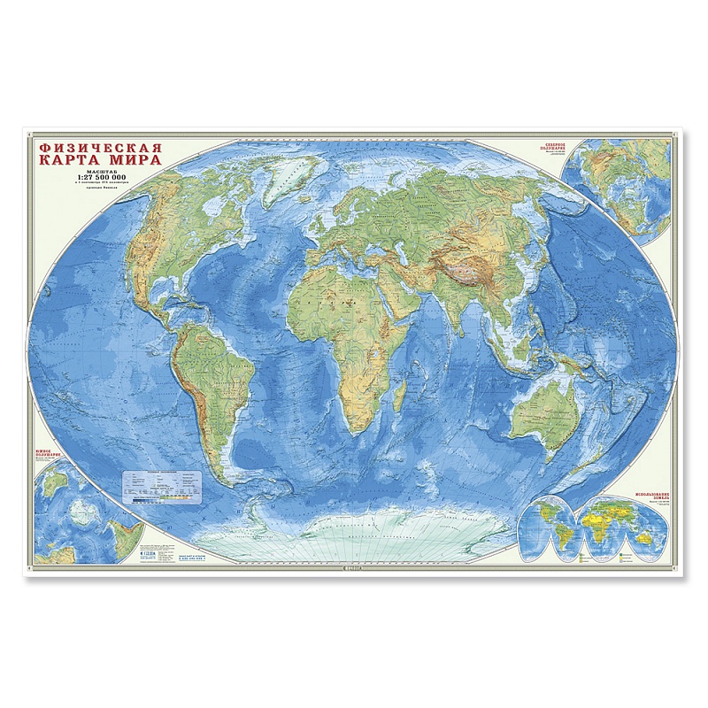 Физическая карта мира передает внешний облик суши и акваторий всей планеты в обзорном масштабе. На карте подробно отражены рельеф и гидрография, а также пески, солончаки, болота, вулканы, коралловые рифы, материковые льды и вечные снега, шельфовые ледники. Показаны значимые населённые пункты.
