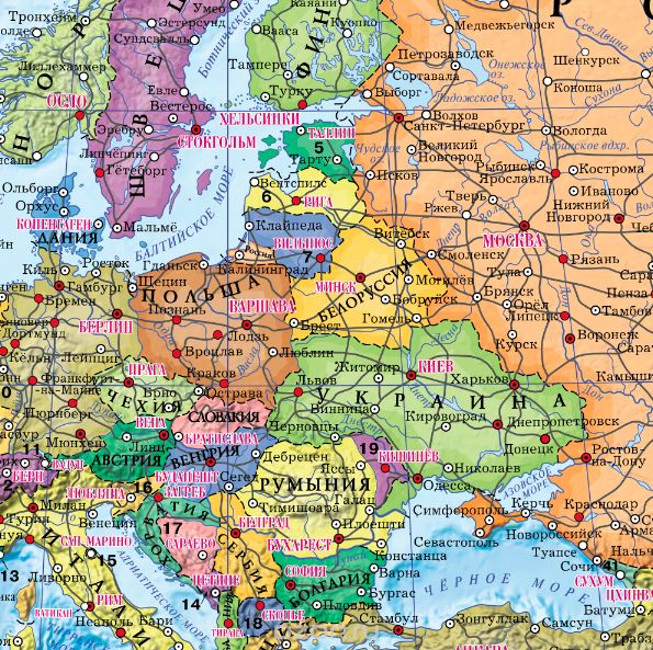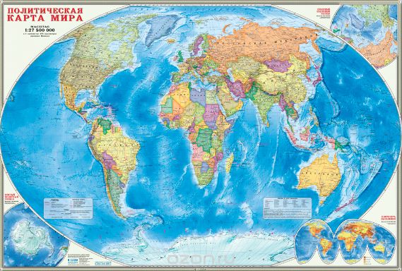 На политической карте мира подробно отражено современное политико-административное устройство мира, даны границы государств. Территории государств выделены цветом. Населённые пункты отображены по числу жителей и административному значению, показаны основные наземные пути сообщения и судоходные каналы. Особенность данной карты в том, что на ней, помимо геополитической информации, размещена символика государств мира. Государственные флаги стран мира сгруппированы по каждому континенту.