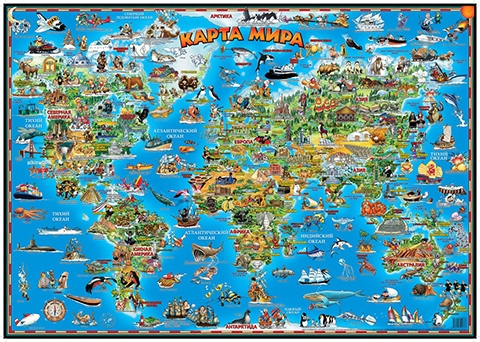 Поверхность карты ламинирована, поэтому на нее не страшно что-нибудь пролить. Любые пятна исчезнут, если протереть карту влажной тряпкой. Закругленные углы защитят ребенка от порезов. Данное настольное пособие – не только достоверная географическая карта, но и сборник увлекательных сведений о флоре и фауне нашего мира, а также о традициях разных стран, авиации, судоходстве и многом другом.