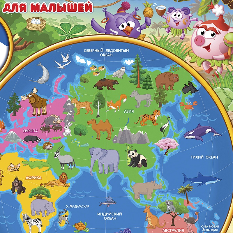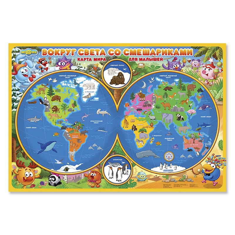 Специально для таких маленьких мечтателей, любопытных исследователей, дружелюбных малышей, как Бараш, Крош, Нюша и Пин, мы создали эту настольную карту со Смешариками, чтобы привлечь внимание деток и в лёгкой мультипликационной форме познакомить с окружающим миром, огромными материками, глубокими океанами и самыми разными животными. Удобный формат карты позволяет расположить ее в любом месте, чтобы она всегда была под рукой у ребёнка. Двойная ламинация защитит от внешних повреждений и загрязнений.