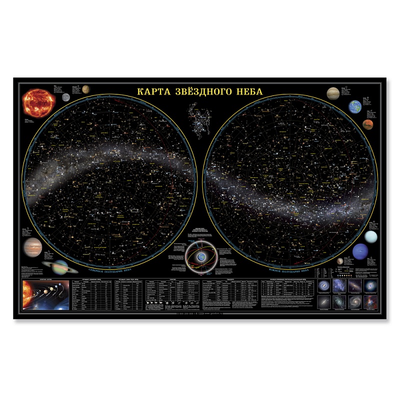 На карте звездного неба также отражена Солнечная система - Солнце и обращающиеся вокруг него небесные тела – 8 планет. Для более точного представления звездного неба даны таблицы характеристик планет, галактик, туманностей, самых ярких звезд и других космических объектов.