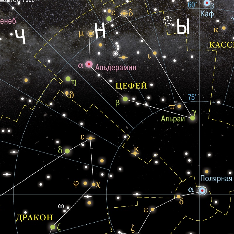 Звездное небо представлено в виде карт северного и южного полушарий (в азимутальной проекции) с изображением неподвижных или медленно изменяющихся объектов звёздного неба - звездами, туманностями, галактиками. Звезды отражены по спектральному классу.
