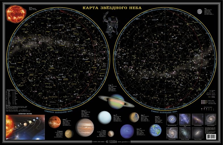 Звездное небо представлено в виде карт северного и южного полушарий (в азимутальной проекции) с изображением неподвижных или медленно изменяющихся объектов звёздного неба - звездами, туманностями, галактиками. Звезды отражены по спектральному классу. На карте зведного также отражена Солнечная система - Солнце и обращающиеся вокруг него небесные тела – 8 планет. Для более точного представления звездного неба даны таблицы характеристик планет, галактик, туманностей, самых ярких звезд и других космических объектов.