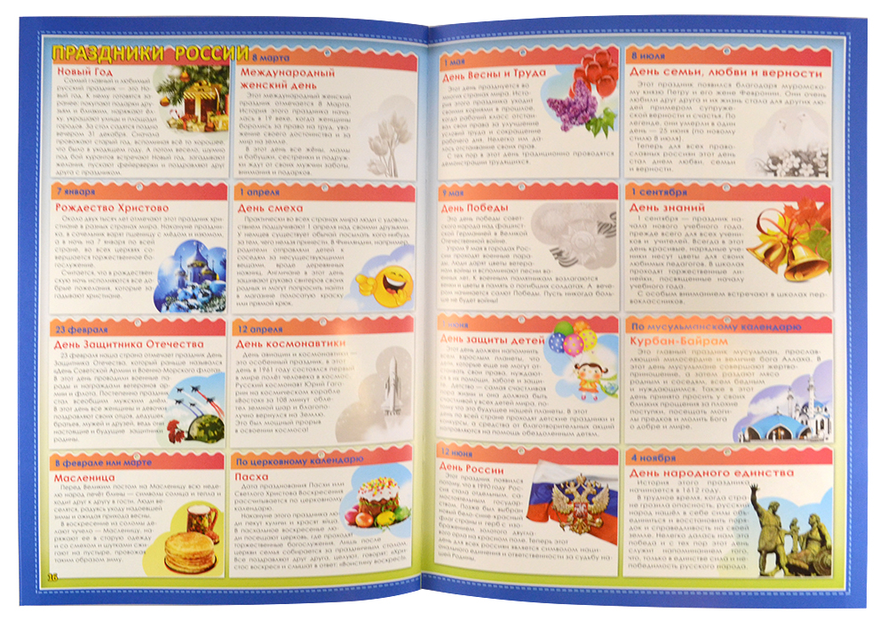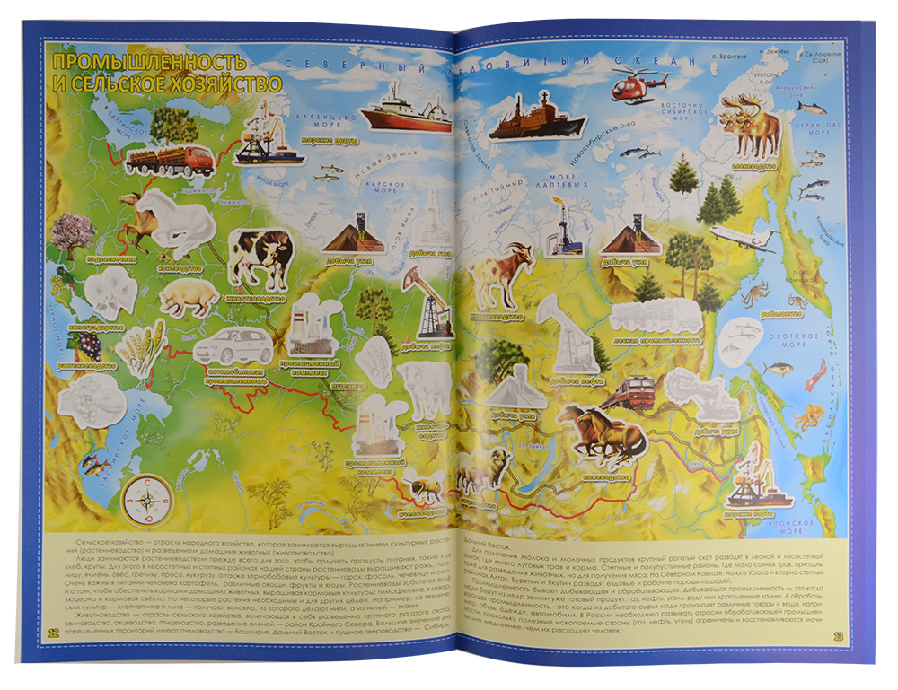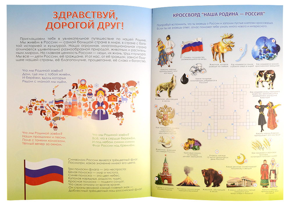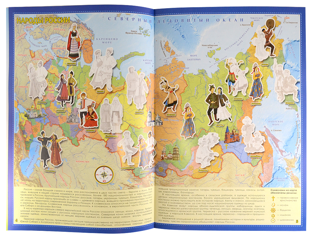 Мы живем в самой большой в мире стране с богатой историей и культурой. Чтобы наши дети имели представление о многогранности России, в атласе "Наша Родина - Россия" мы наглядно показали, какое разнообразие животных и растений обитает на территории страны, какие народы ее населяют. Также в атласе представлены самые интересные места нашей Родины. На страницах атласа России с наклейками представлены и полезные ископаемые, которыми богата наша земля, и виды хозяйственной деятельности, которыми занимается население России. Внутри размещено описание основных праздников, которые празднуют россияне.