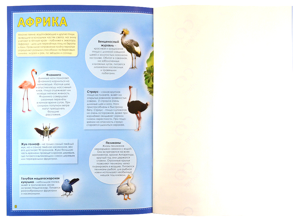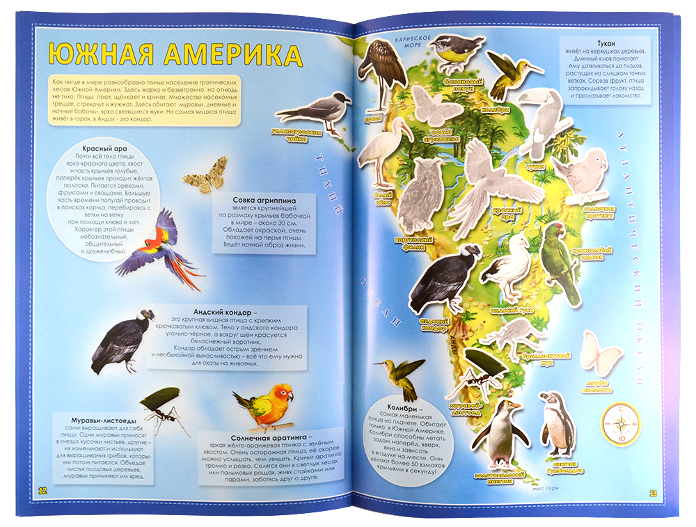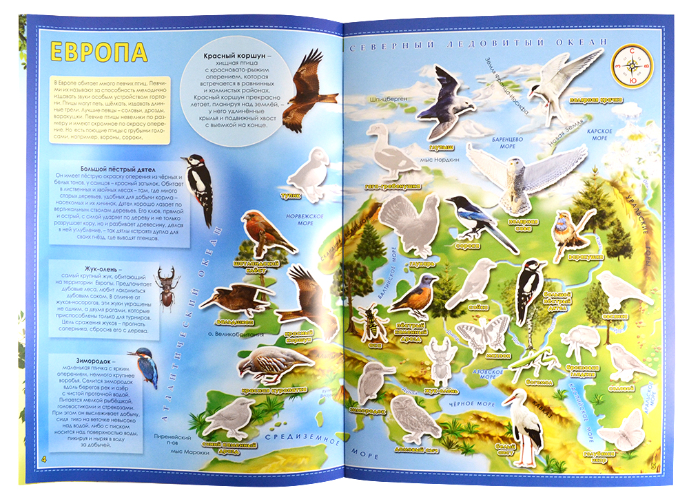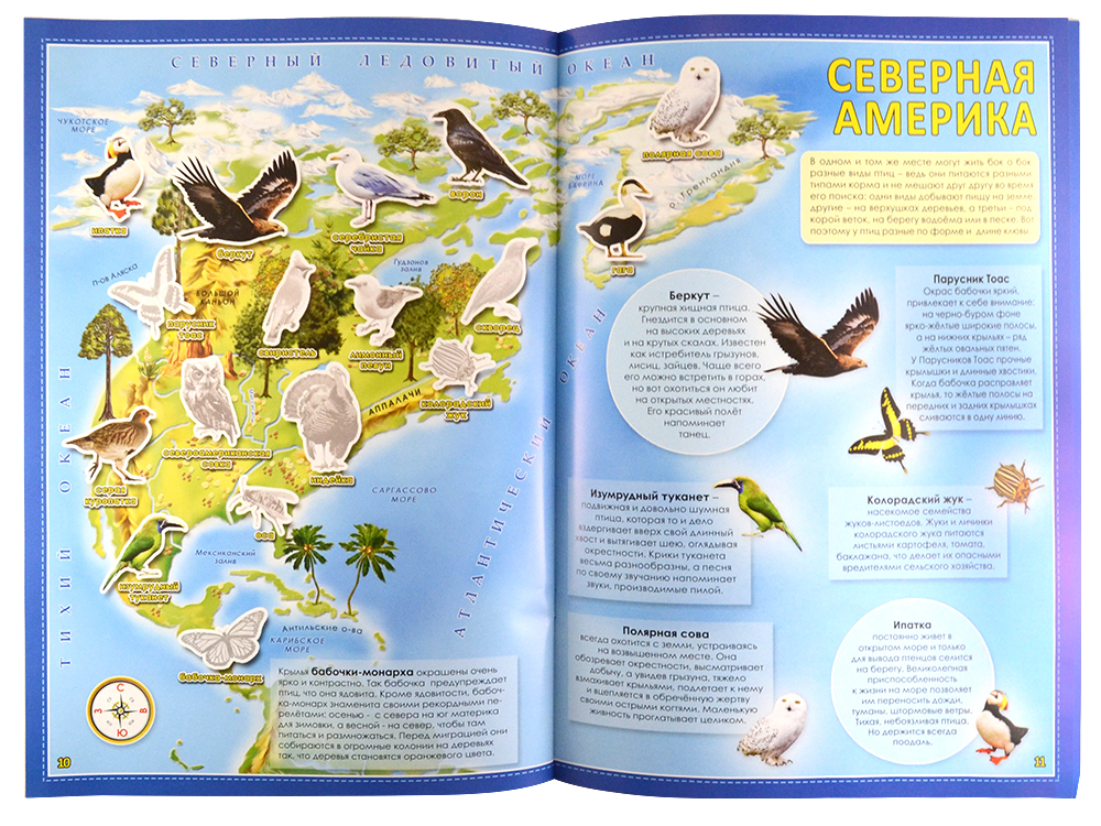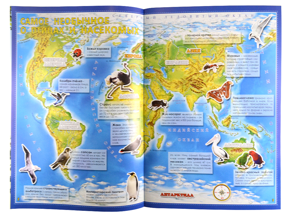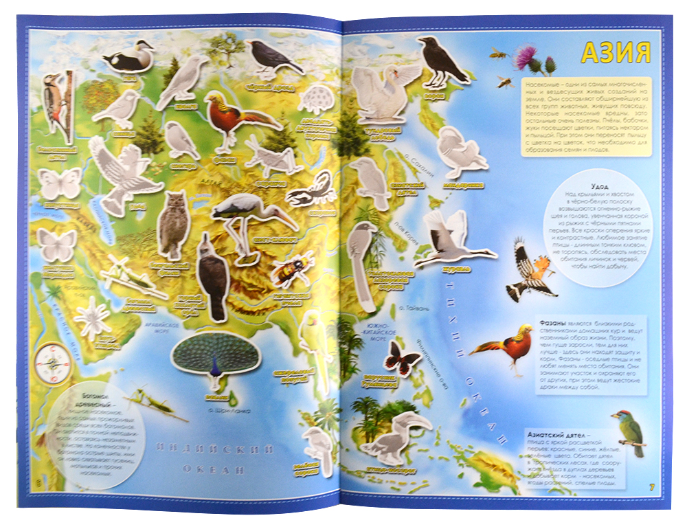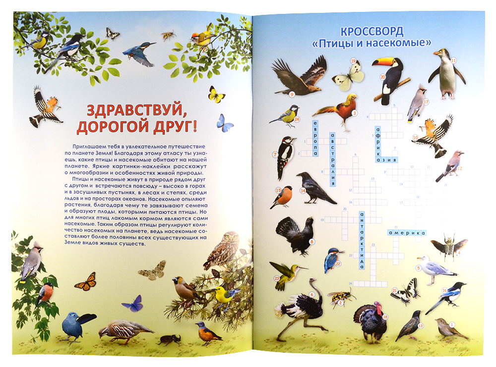 Этот выпуск детского атласа с наклейками посвящен птицам и насекомым. Перелистывая страницы, ребенок узнает много интересного о пернатых обитателях всех континентов, а насекомые поразят своими удивительными способностями. Самые редкие и привычные нам птицы расположились на страницах среди красивых бабочек, пчёл и жуков.