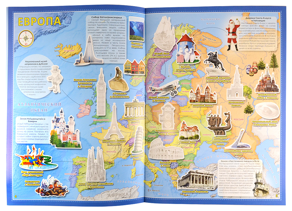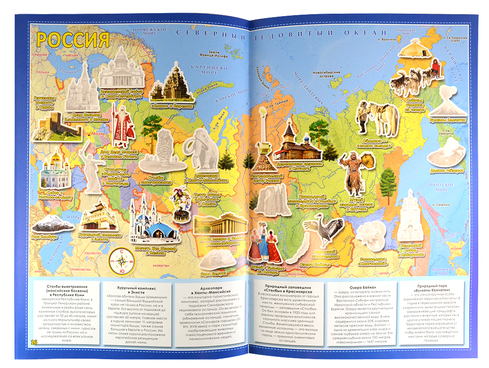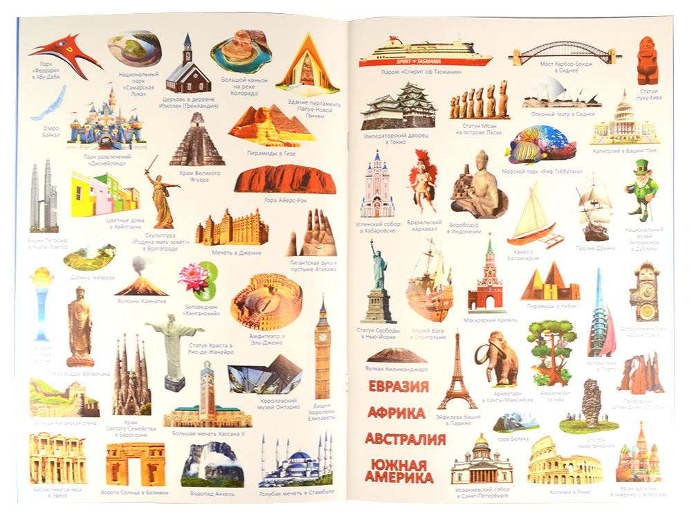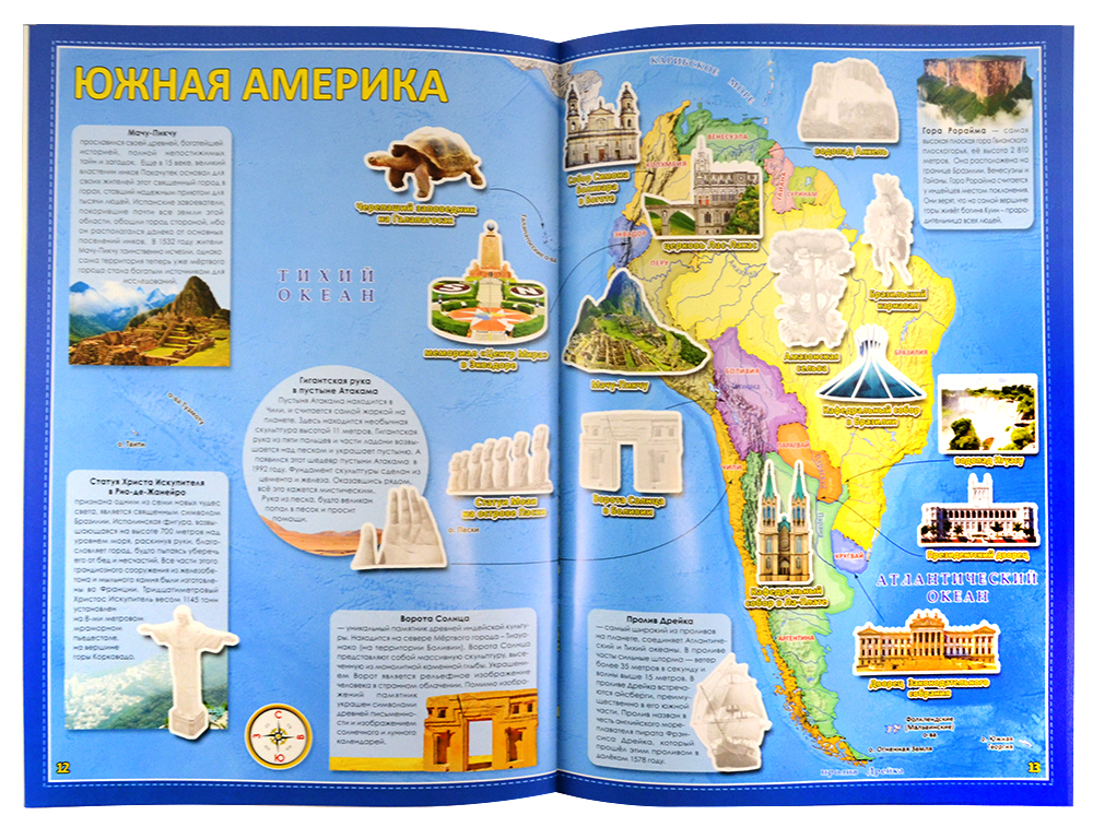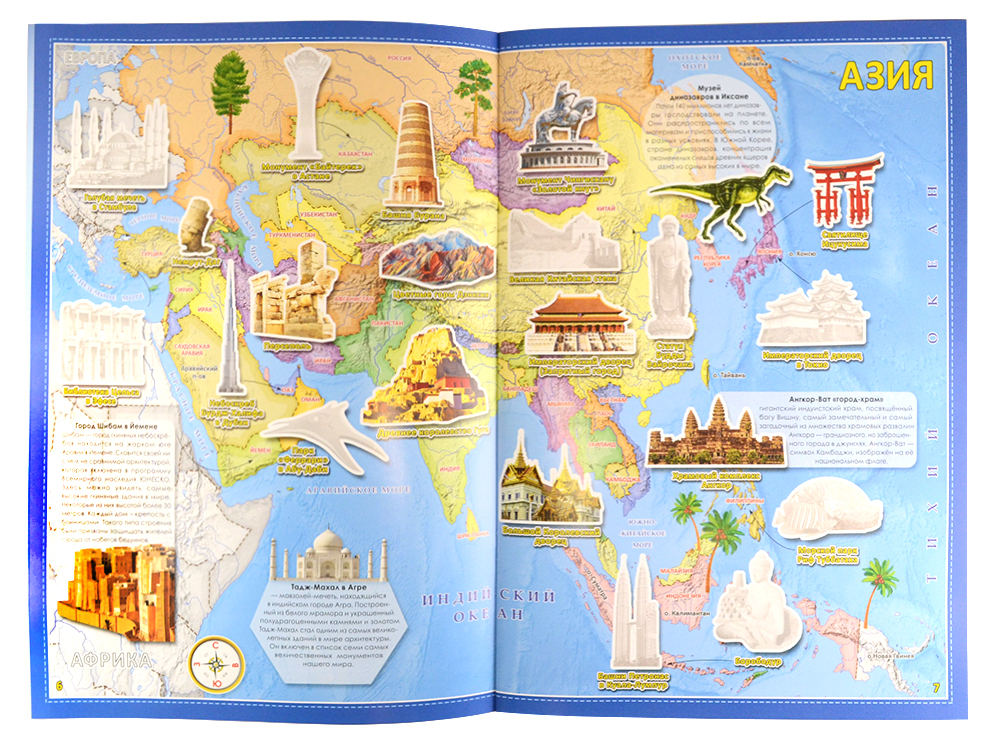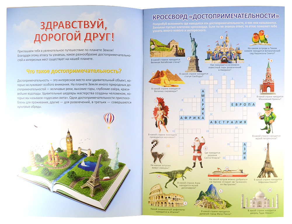 Детский атлас мира с наклейками "Достопримечательности" познакомит Вашего ребенка с красивыми, интересными и увлекательнейшими местами мира. Памятники архитектуры, гигантские статуи и монументы, являющиеся культурным наследием – все это отражено в атласе с наклейками! Красочные иллюстрации и тщательно подобранная информация делают процесс познания творческим. Кроссворд поможет лучше познакомиться с интересными местами мира!