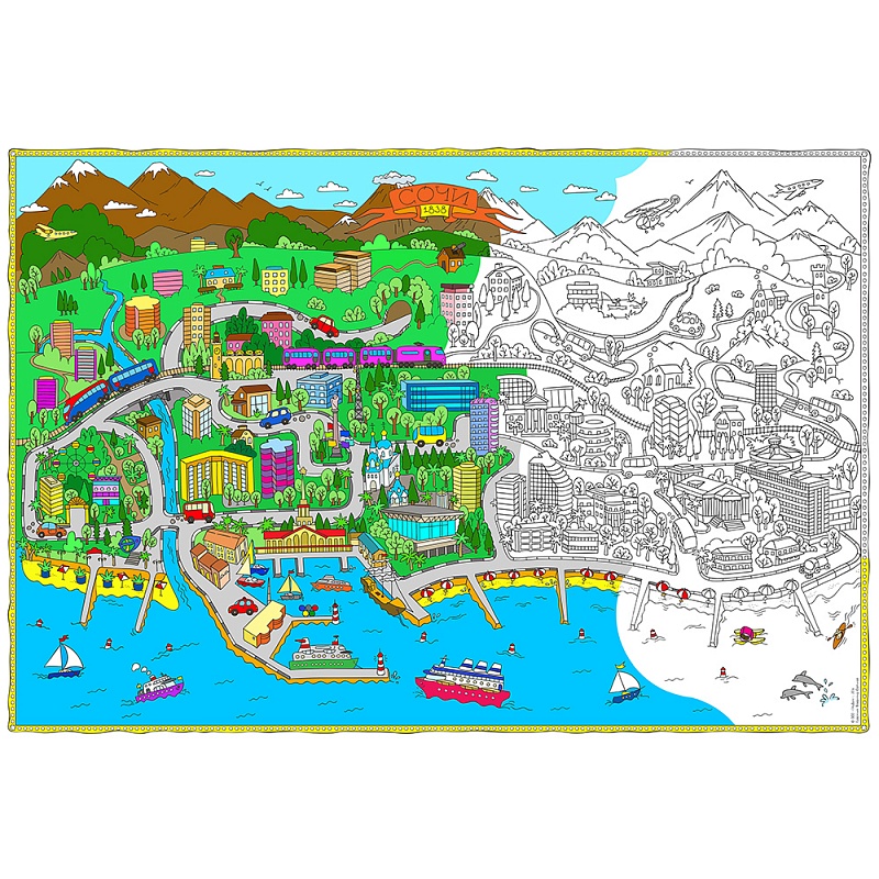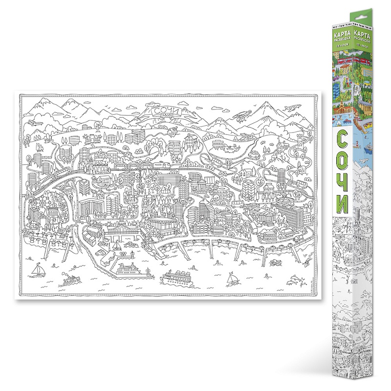 Новая карта-раскраска "Сочи" - не просто раскраска, а настоящее путешествие! Отправьтесь всей семьей на прогулку по городу, изучите достопримечательности и интересные места, пройдитесь по залитой солнцем набережной, наполните город яркими красками! Раскраска подарит новые впечатления и увлечет вашего ребенка. Сюжет раскраски будет интересен и мальчикам и девочкам, а родители смогут рассказать интересную историю о городе и о местах, в которых они побывали.