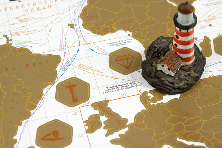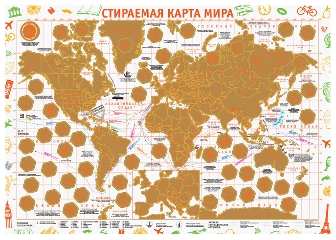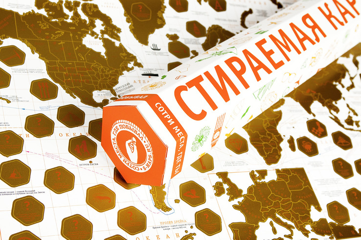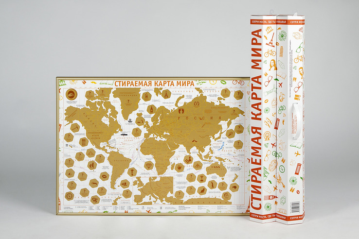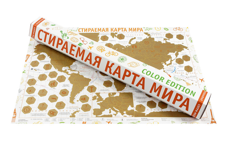 Карта Мира покрытая золотой, стирающейся скретч-краской в оригинальном картонном тубусе. Яркий внешний вид, детализация областей России, любопытные факты и более 100 вопросов в виде викторины подарят самые позитивные эмоции получателю Скретч-карты мира.