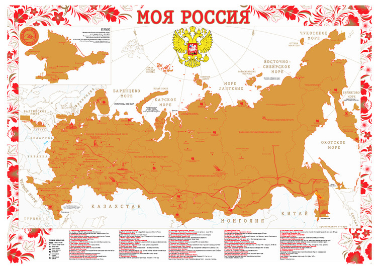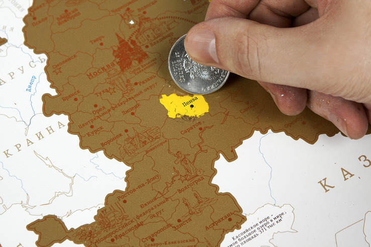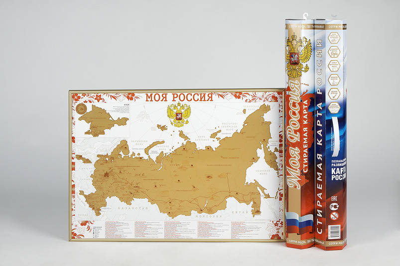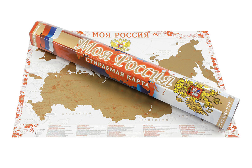 Карта России покрытая золотой, стирающейся скретч-краской в оригинальном картонном тубусе с пластиковой ручкой. Карта позволяет убедиться в какой многогранной, интересной и великой стране мы живем. Мы собрали все великие события и главные достопримечательности на одной карте.