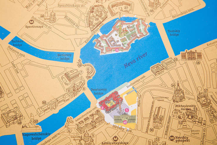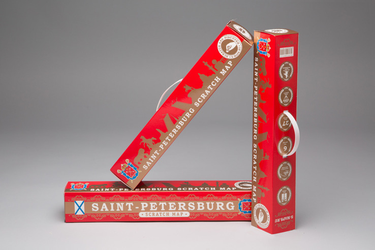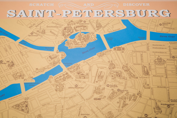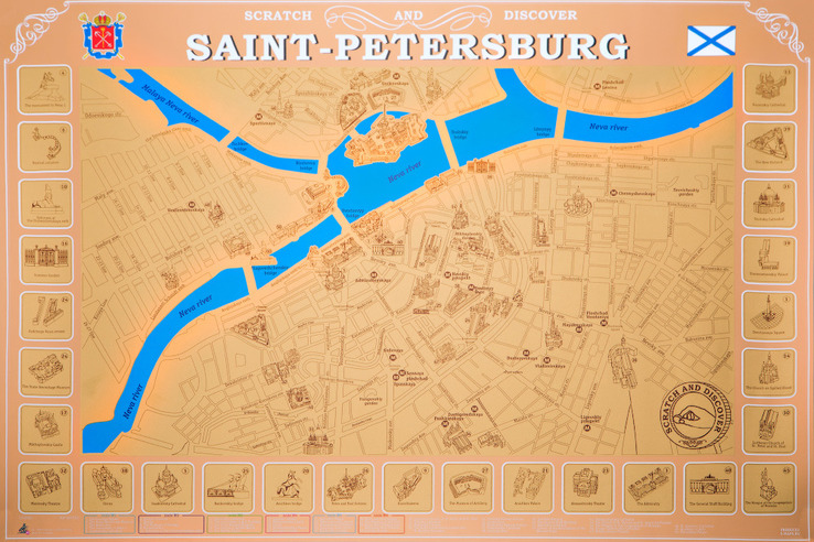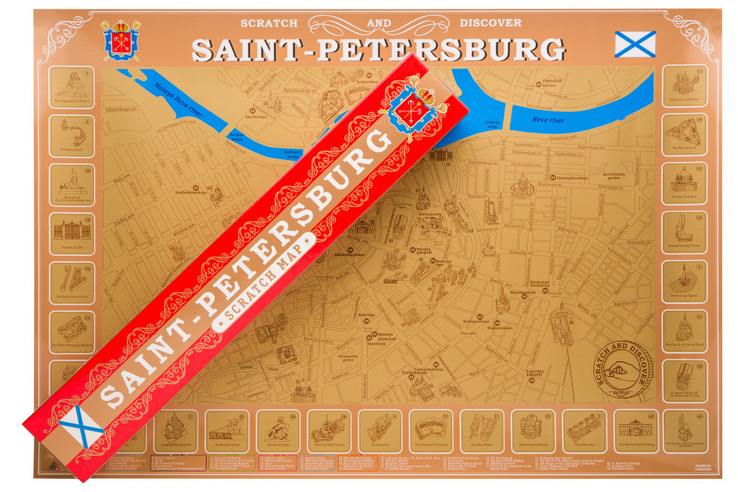 Карта напечатана в ярких цветах с использованием золотой и бронзовой краски. Стирая золотую краску монеткой – вы можете отмечать места где побывали в Санкт-Петербурге и планировать свои маршруты по городу. Упаковка в сувенирном стиле снабжена пластиковой ручкой.