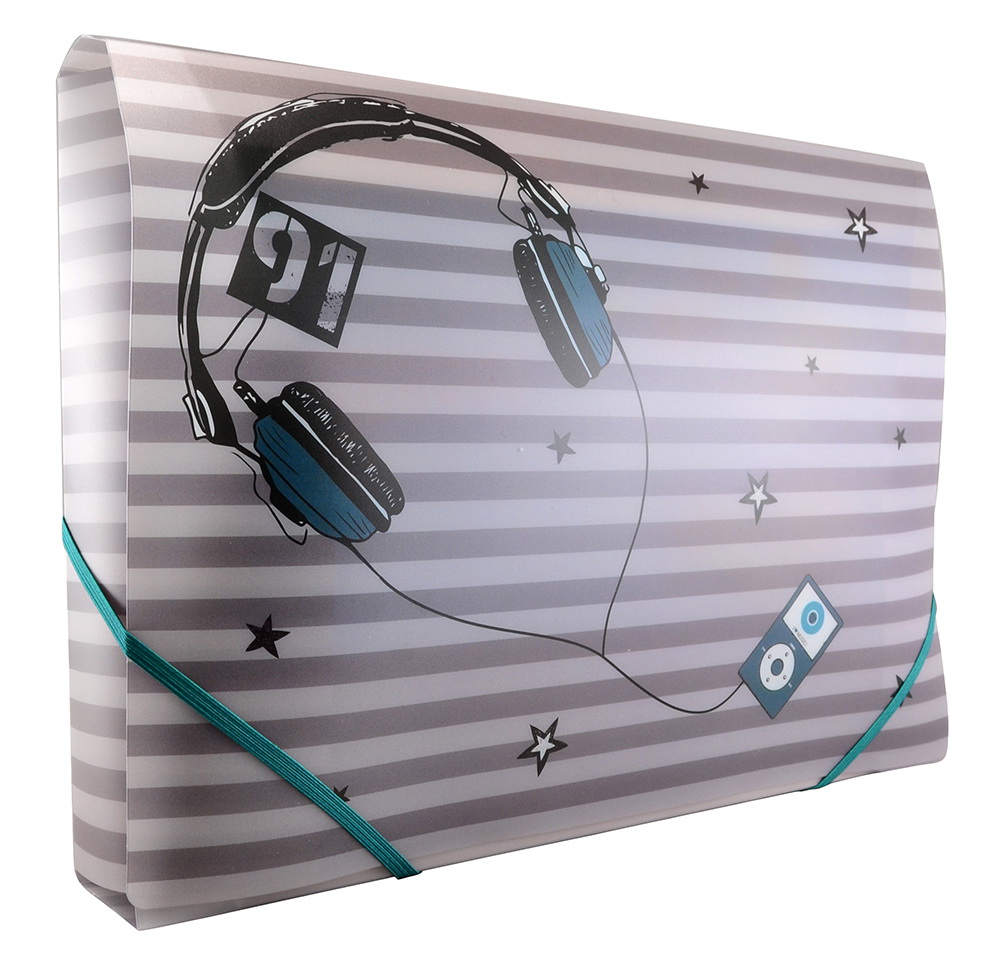 Папка из плотного пластика для хранения и транспортировки тетрадей и других бумаг формата А4. Сгибая папку по одной из трех линий сгиба сверху и снизу, можно регулировать ее ширину дна. В сложенном виде папка фиксируется по уголкам эластичной резинкой.