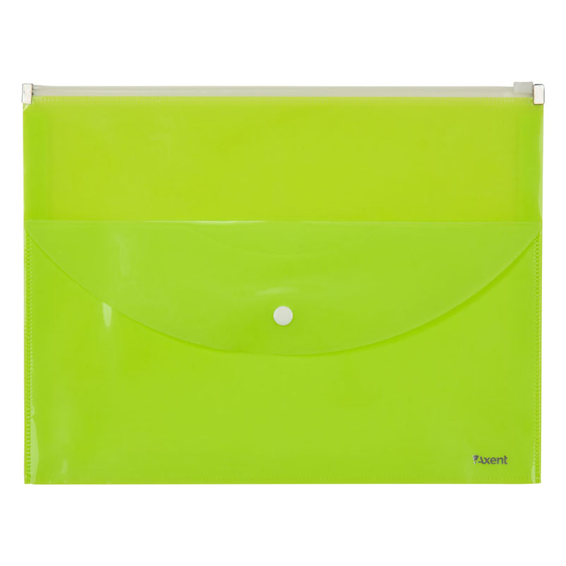Папка-конверт Axent на застежке zip-lock. Вместимость: до 250 листов. Дополнительный карман на кнопке. Толщина пластика: 180 мкм. Полипропилен (РР).