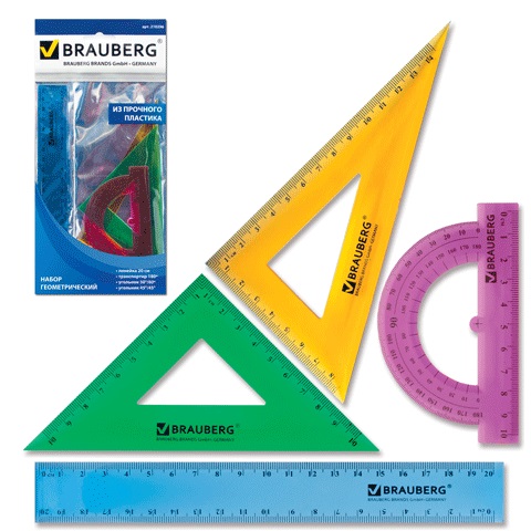 Набор геометрический из яркого, прочного пластика толщиной 1,6 - 2 мм. Предназначен для чертёжных работ. Включает четыре предмета: линейка, 2 треугольника, транспортир.
