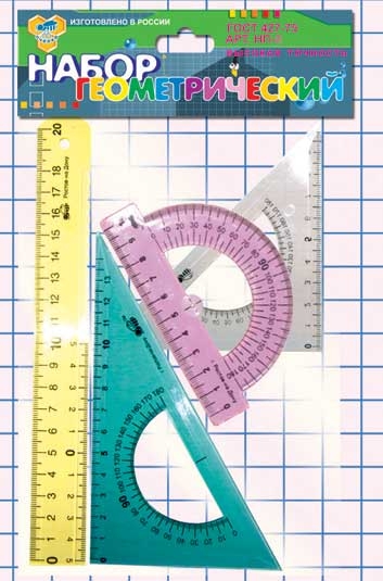 Набор геометрический средний (линейка 20 см, транспортир, треугольник 45/45, треугольник 30/60)