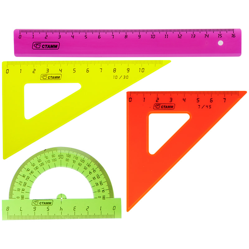 - В наборе: линейка, 2 треугольника, транспортир