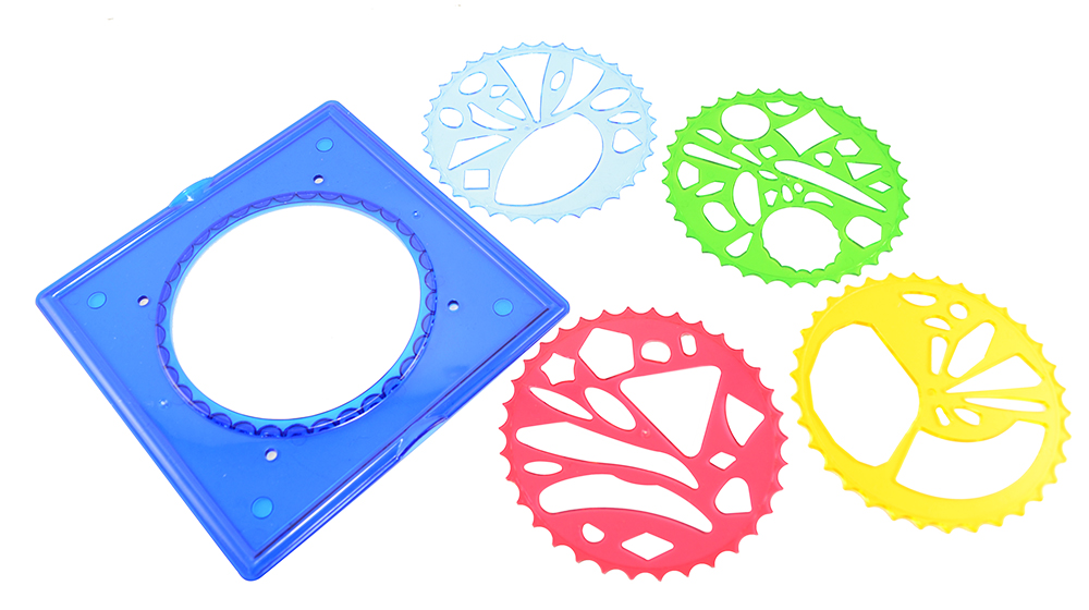 - В наборе: пластина , 4 зубчатых колесика с различными трафаретами