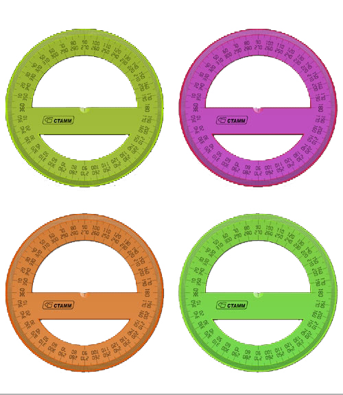 Транспортир изготовлен из прозрачного пластика, предназначен для чертежных работ. Отверстие для карандаша позволяет точно находить центр и вычерчивать окружность 360 градусов. Шкалы и логотип нанесены методом термопечати, устойчивы к истиранию.