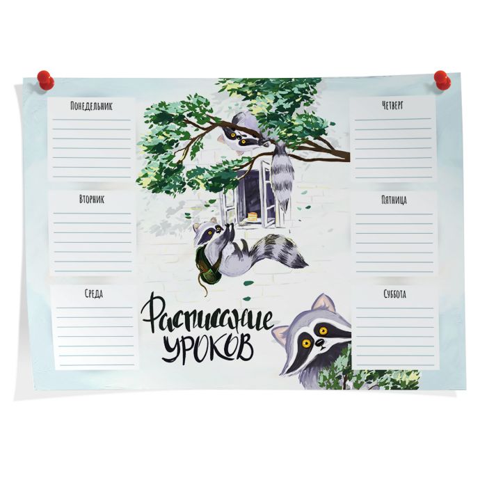Расписание уроков А4 "Озорные еноты" уф лак, горизонтальное