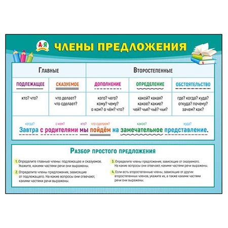 Красочное наглядное пособие для школьников удобного формата А2. На пособии представлены все члены предложения, с нужными подчеркиваниями и примерами, а так же алгоритм разбора.