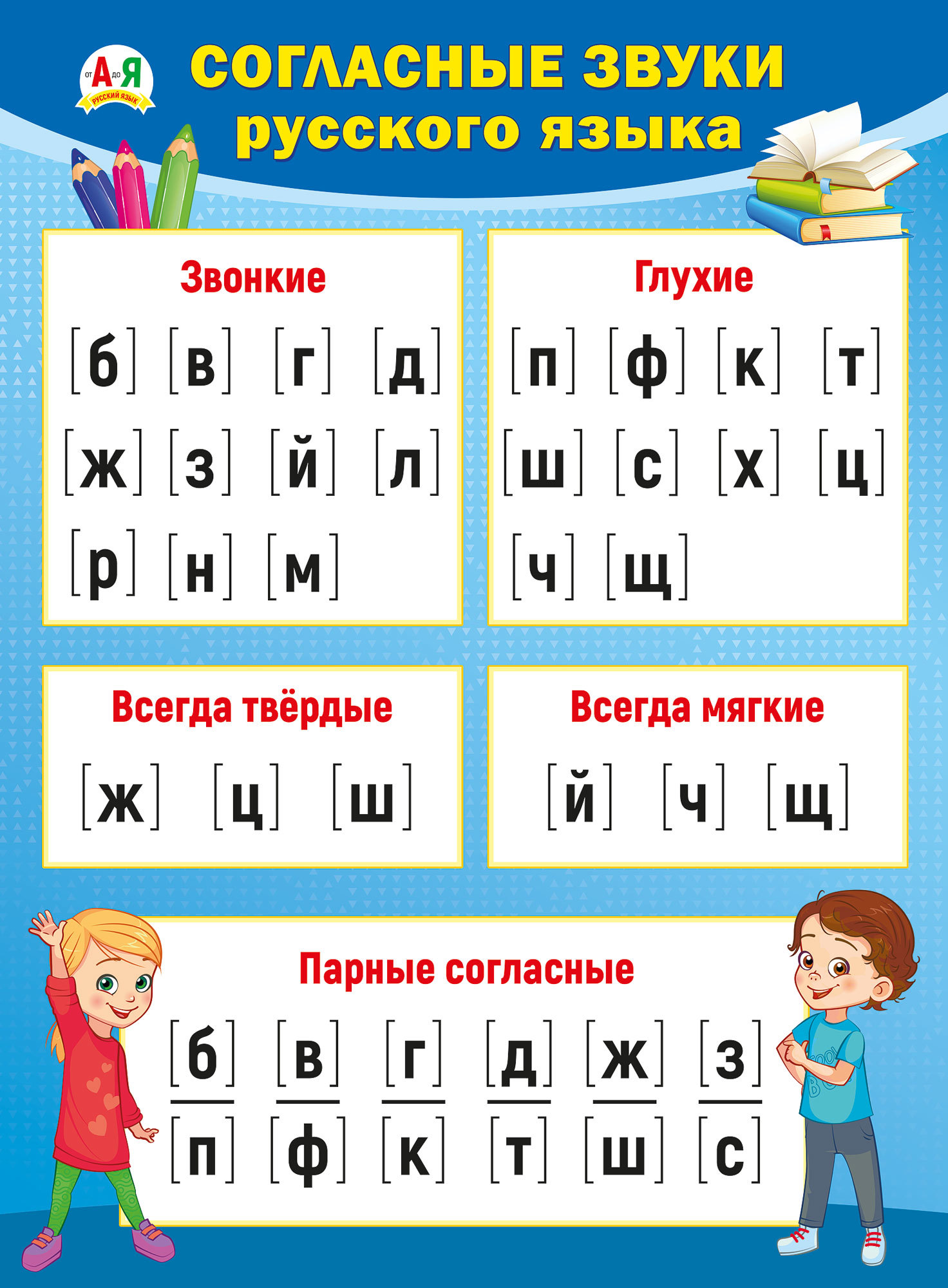 Красочное наглядное пособие для школьников удобного формата А2. На пособии представлены все согласные звуки русского языка: звонкие, глухие, всегда твердые, всегда мягкие и парные.