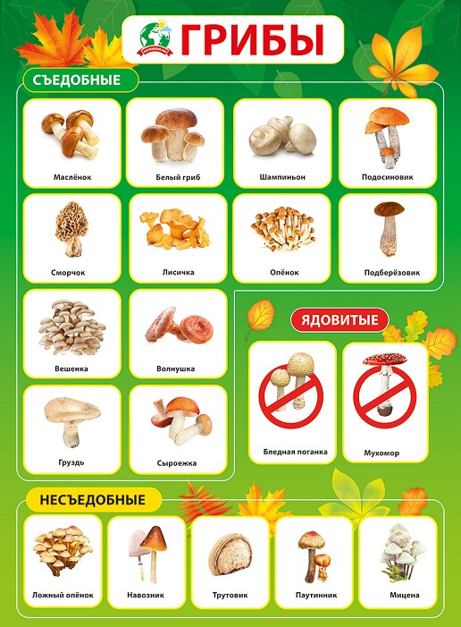 Красочное наглядное пособие для школьников удобного формата А2. На пособии представлены большинство видов грибов: съедобные и несъедобные.