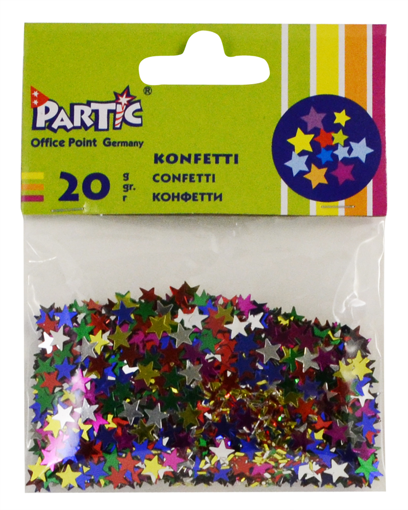 Мелко нарезанный цветной пластик в форме звездочек. Используется для декорирования стола - конфетти рассыпанное на столе является необычной и привлекательной формой украшения праздничного застолья.