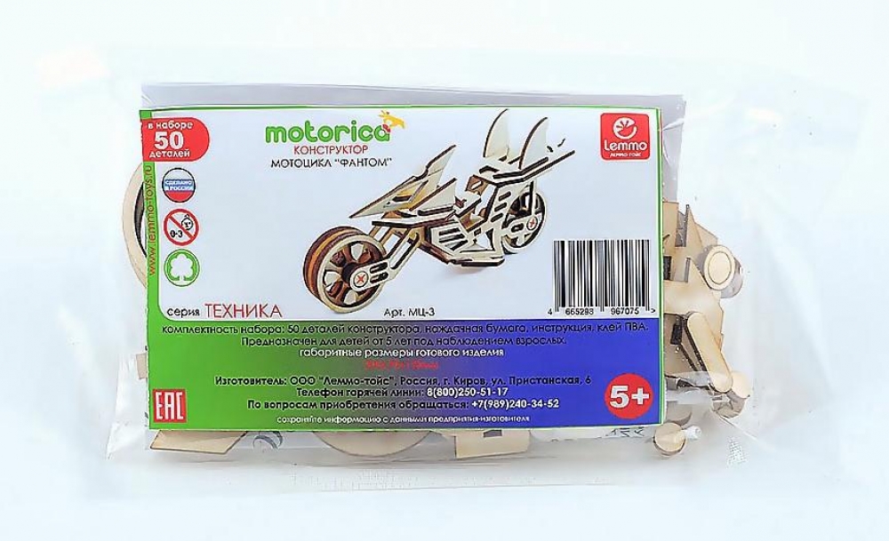 Набор для творчества. Конструктор 3D деревянный подвижный Lemmo Мотоцикл Фантом*