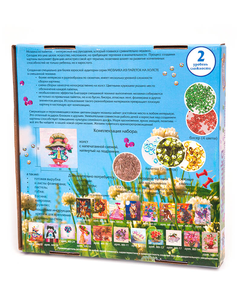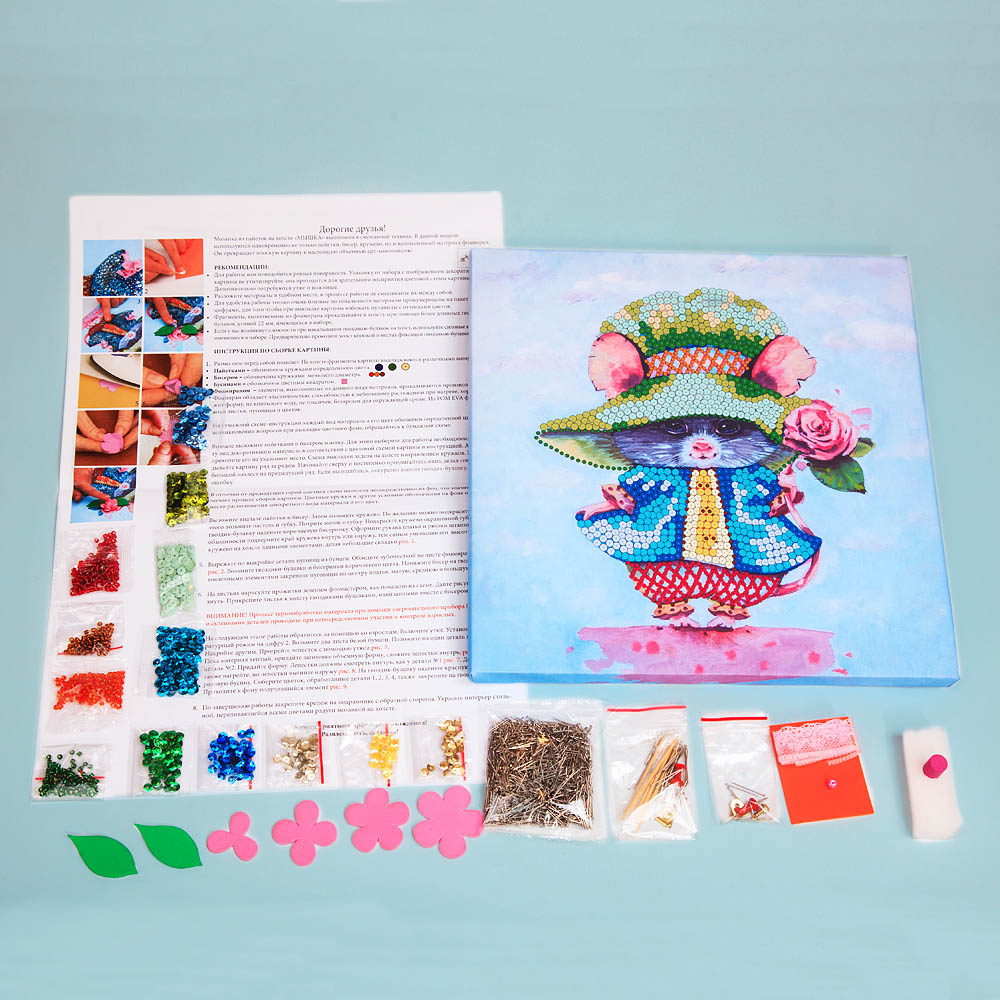 - В наборе: холст с напечатанной схемой, натянутый на подрамник, пайетки, готовая вырубка и лист фоамирана, бисер, бусины, кружево, пастель, губки, выкройка, гвоздики-булавки, силовые иглы, крепеж для крепления картины, пошаговая инструкция