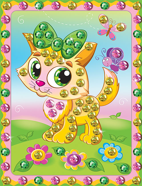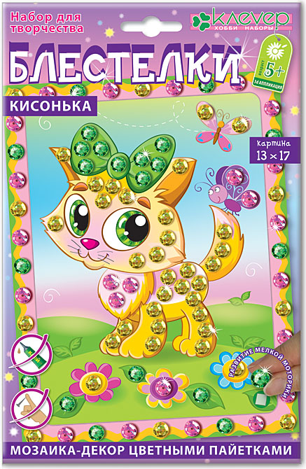 Милая кошечка беззаботно играет с бабочками на поляне в ясный летний день. Мини-картины серии «Блестелки» - первые шаги ребёнка старше 5 лет в освоении интересной и красочной техники мозаики. Это самый простой пример мозаики - не сплошное составление картины из мелких элементов, а декорирование её отдельных частей. Украсьте картину разноцветными искрящимися пайетками! Без клея - аккуратно и чисто!