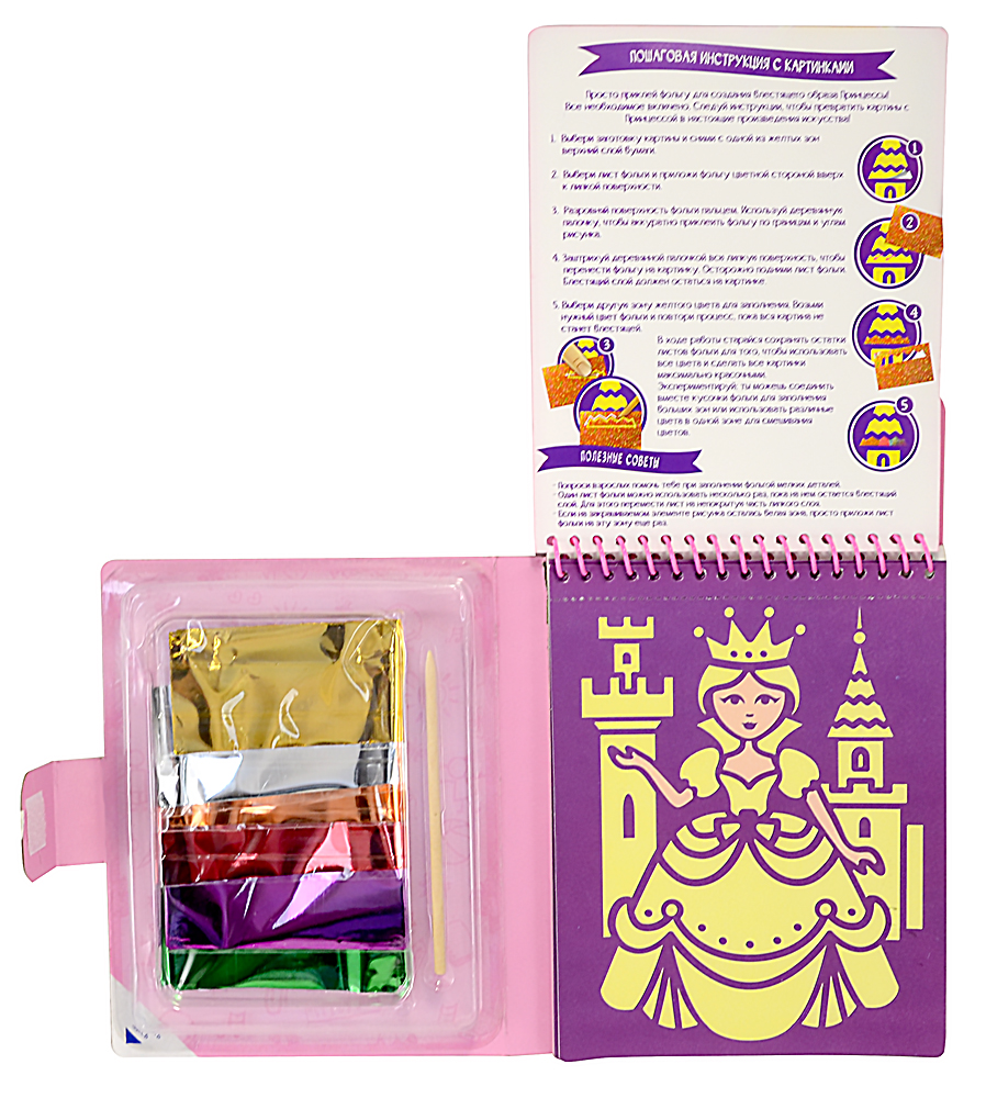 Фольга хранится в пластиковой коробке. Рисунки и инструкция на гребне на картонной основе с европодвесом.