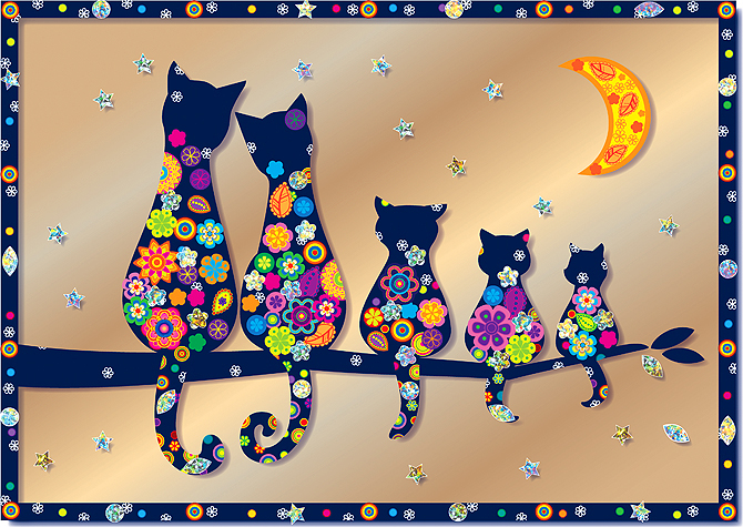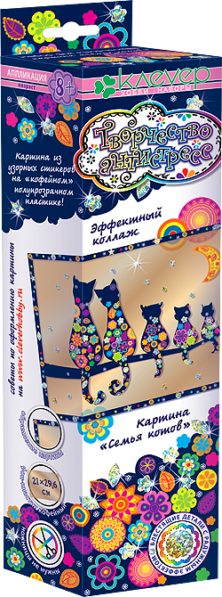 Картина-коллаж из стильных стикеров на затемнённом полупрозрачном фоне «Семья котов» понравится ребёнку старше 8 лет: он легко наклеит на пластик части рамки, силуэты ветки и всю кошачью семью, а затем украсит картину узорными и блестящими стикерами. Особенно эффектно картина смотрится на фоне узора обоев, который слегка просвечивает сквозь полупрозрачный пластик кофейного оттенка. А в рамке из багета картина-коллаж превратится в настоящий шедевр и станет ярким акцентом в любом интерьере!